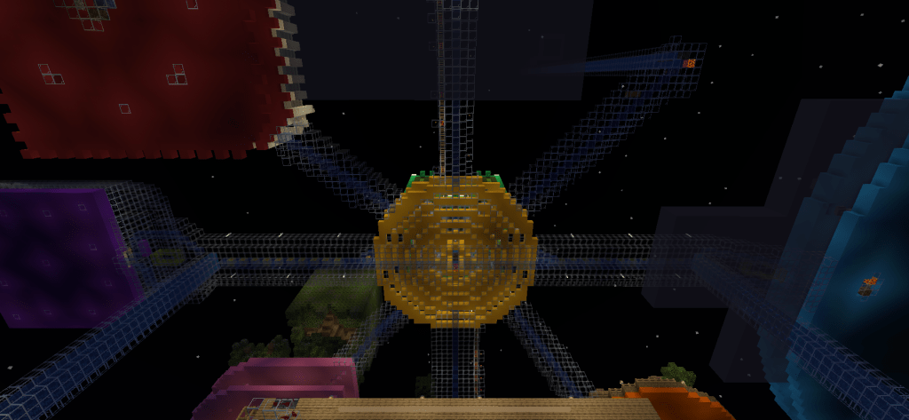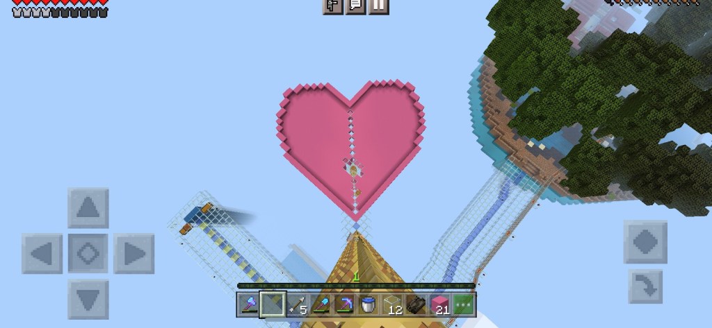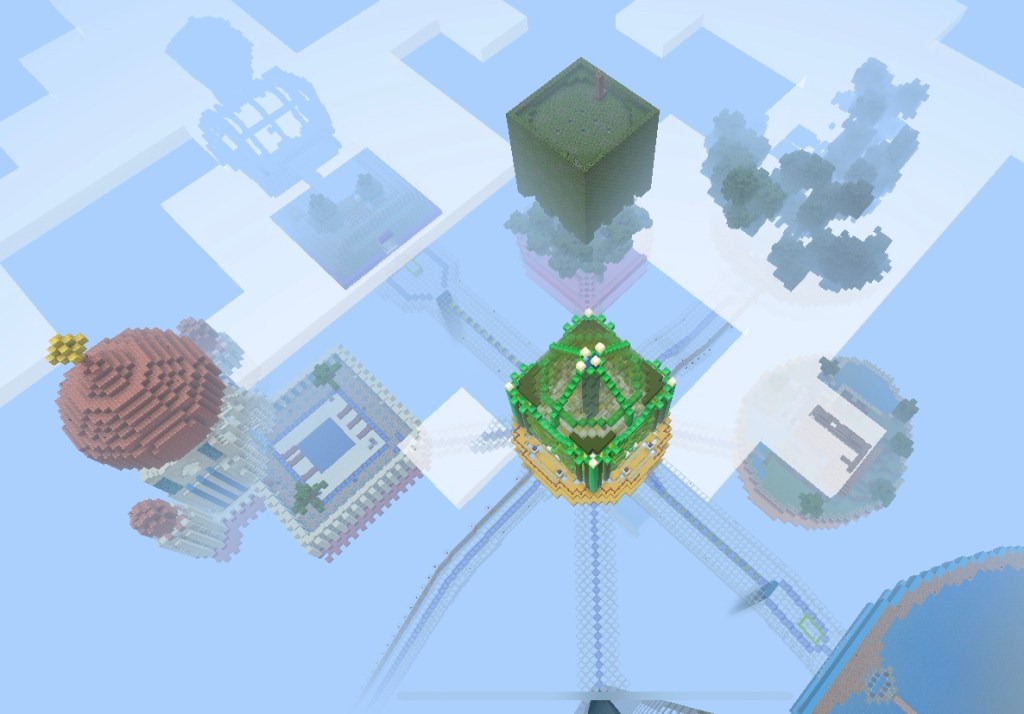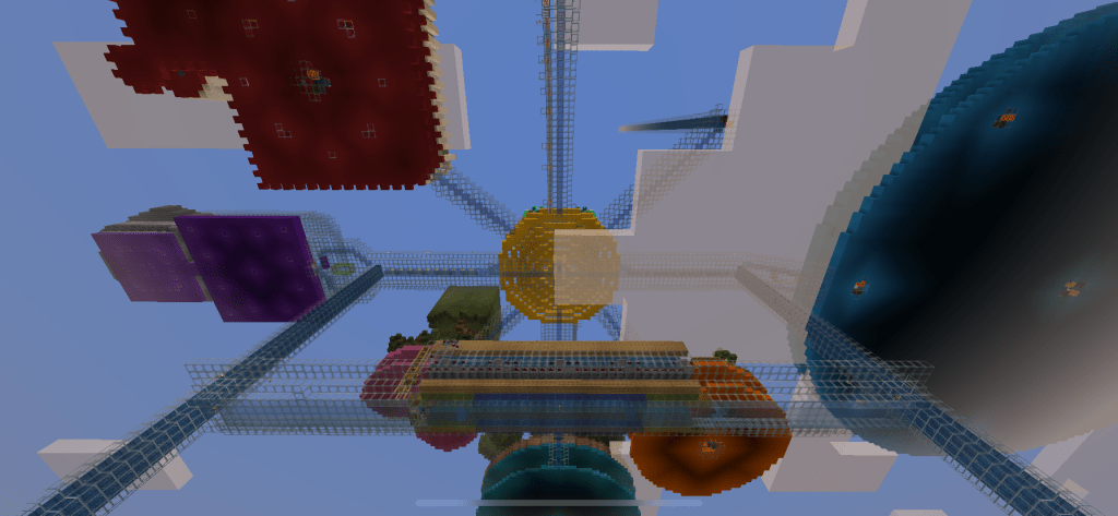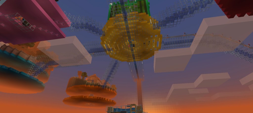 After spending a far bit of time squinting at my screen in the deep dark and trying to copy an architectural masterpiece (that was out of my league) my idea for the Sky Island was to do the opposite. I wanted lots of light, creativity and colour. Ali also wanted to have more say on the builds now. She doesn’t like the deep dark and the intricate geometry of the Hagia Sophia is quite meaningless to her (she’s 6 years old). I was happy for her to have a big creative input. So some of the Sky Islands are more from a child’s perspective. Basically as far away as possible from the black basilica.