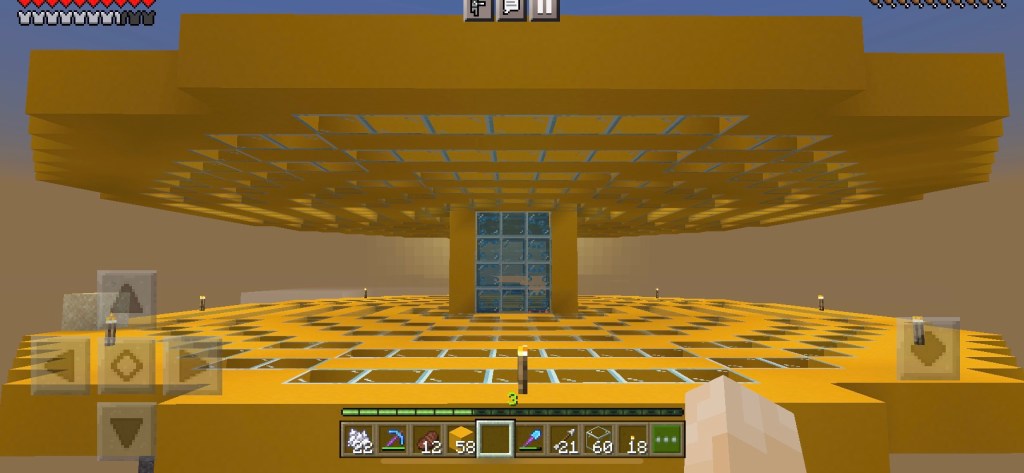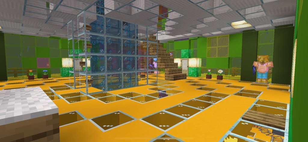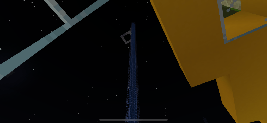 As soon as we had extended the bubble lifts up to cloud level our first build was Ali’s Palace. I chose yellow concrete for the base and she chose emerald blocks for the walls. Lots of glass and some green concrete also because emeralds blocks are rare and the castle (directly below) needed sunlight.