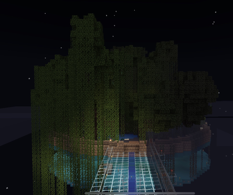 The swamp was all my idea. It is situated a few blocks behind the worlds new (sky) spawning location. It’s not a very big island but because of the mangroves it’s quite easy to get tangled up and lost. It has a very small mud brick village on it. The Sky Swamp is a dangerous place at night. Ali is not a fan.