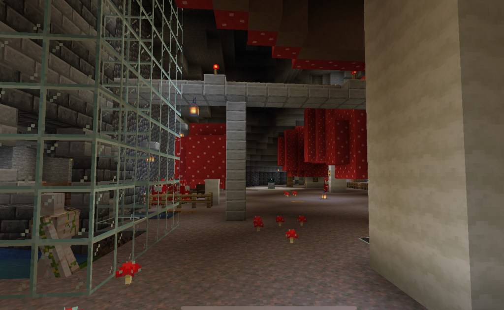 I sporadically placed some mycelium to change the dirt and grew Minecraft’s giant mushrooms with bonemeal. On the surface I did think about building my own more stylised giant mushrooms, but actually Minecraft’s ones are good.