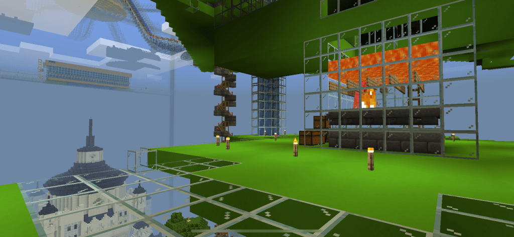 I put in the iron farm which was much needed and long overdue. I had planned to build four golem spawning points, attached by flowing water to a single killing chamber. I wanted an iron forge, but after various tries I couldn’t get it to work (villages need too much space between them for me to get it to function), I’ve still ended up with chests of iron out of the 20 villager village that does produce golems. I have left in all the failed iron forge building work, because I don’t mind the look of it and I might find another use for it.