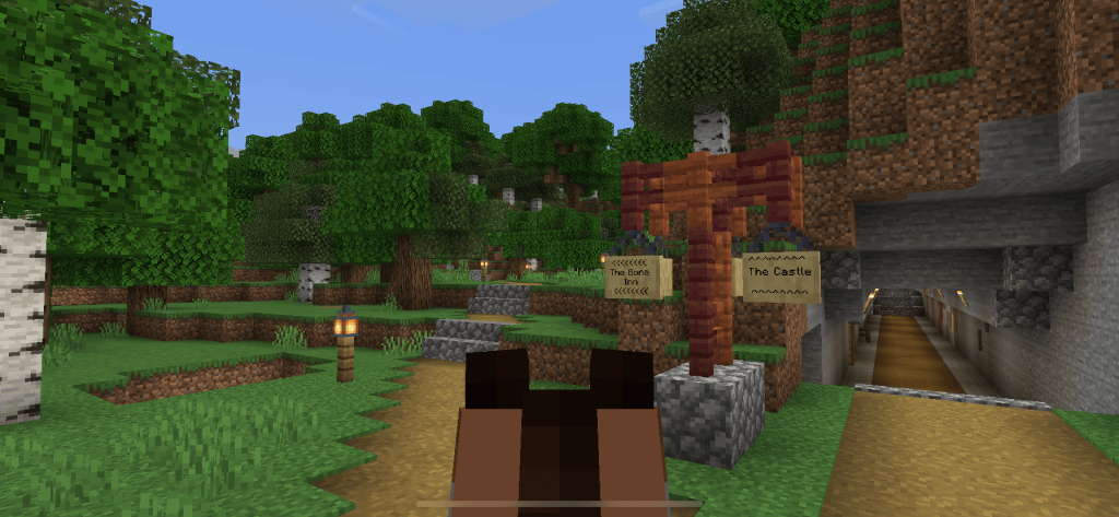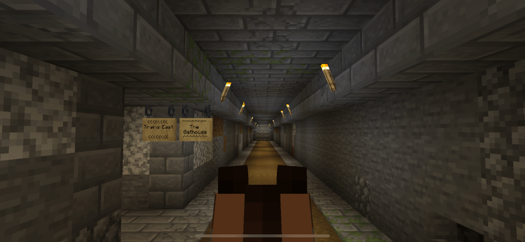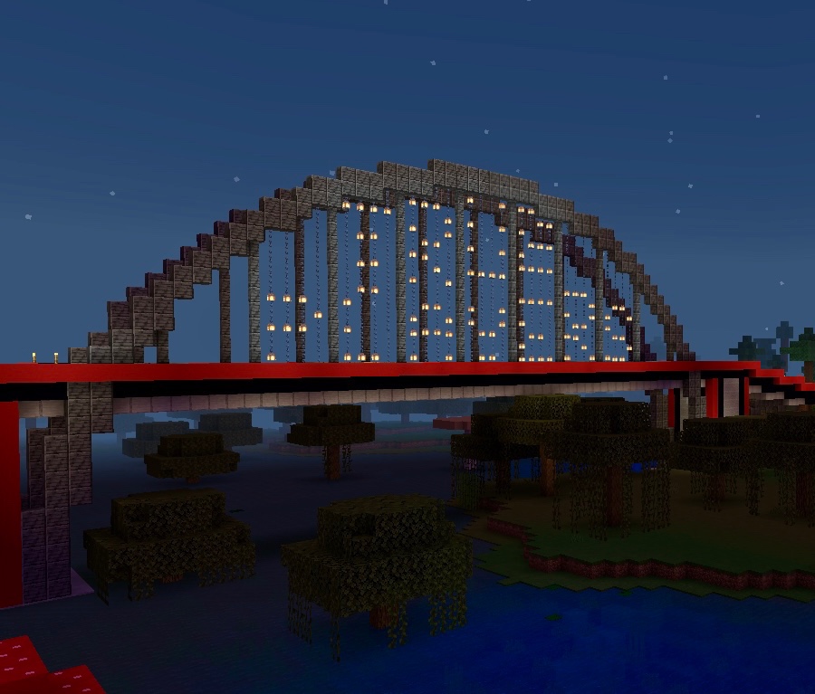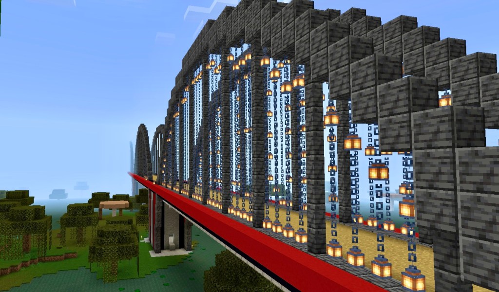 At the Bone Inn you follow the road around to the west and you are soon at the Longbridge. The Longbridge is probably worthy of a post of it’s own. It’s made from smooth stone, red and black concrete, polished deep slate, dirt for the track, stone and cobblestone and a lot of lamps and chains. The lamps cost a gem each so are kind of a big deal I guess.