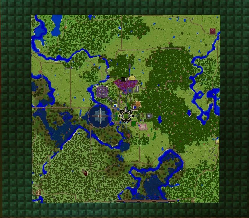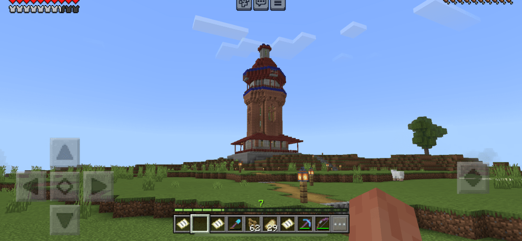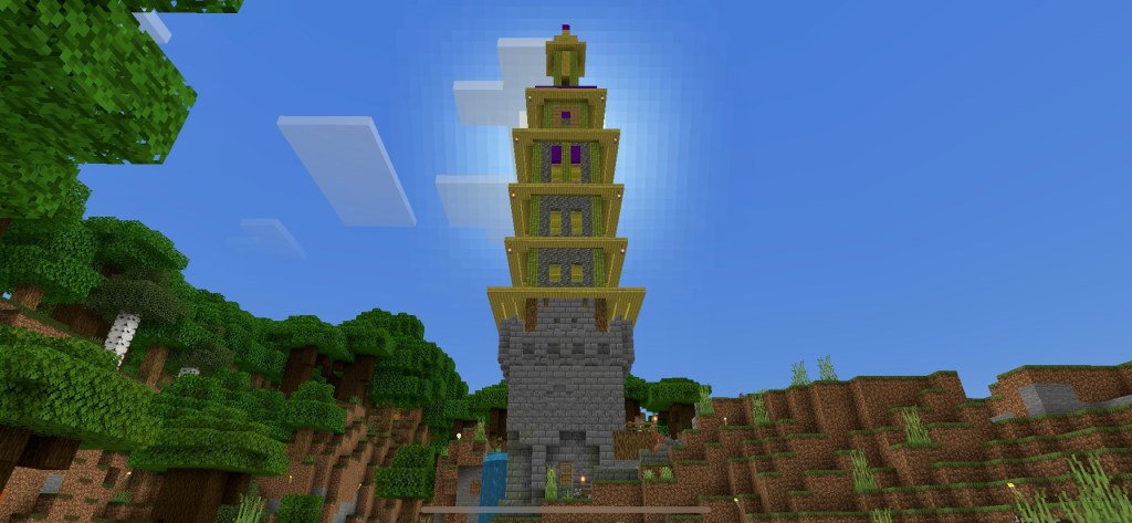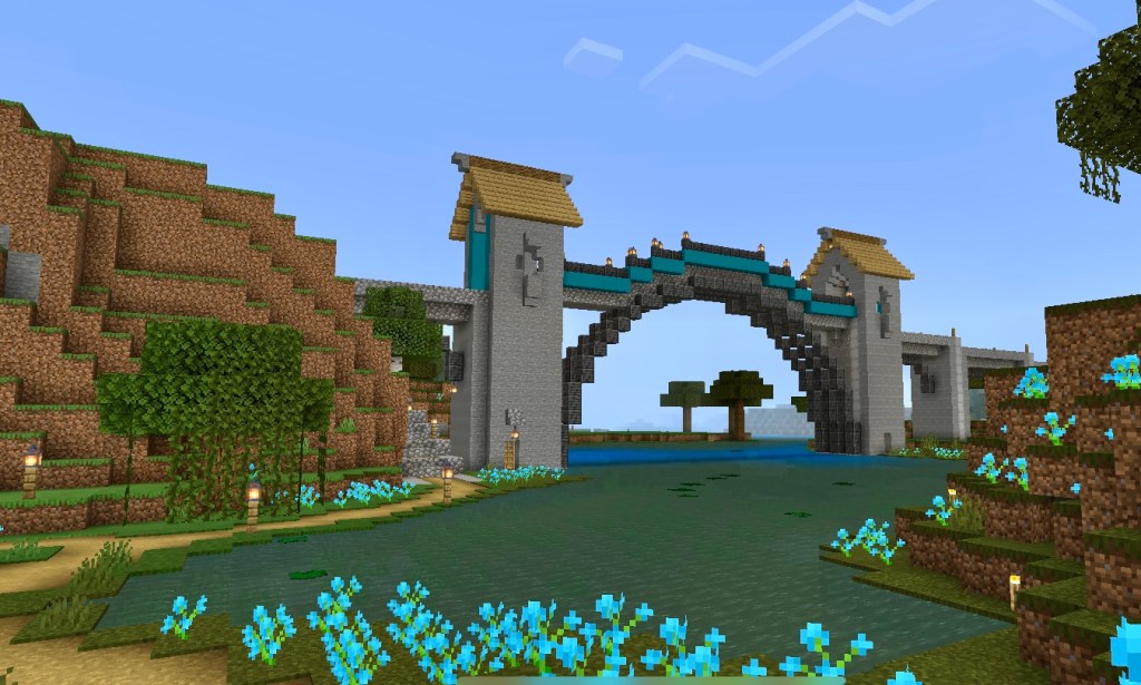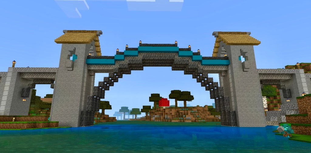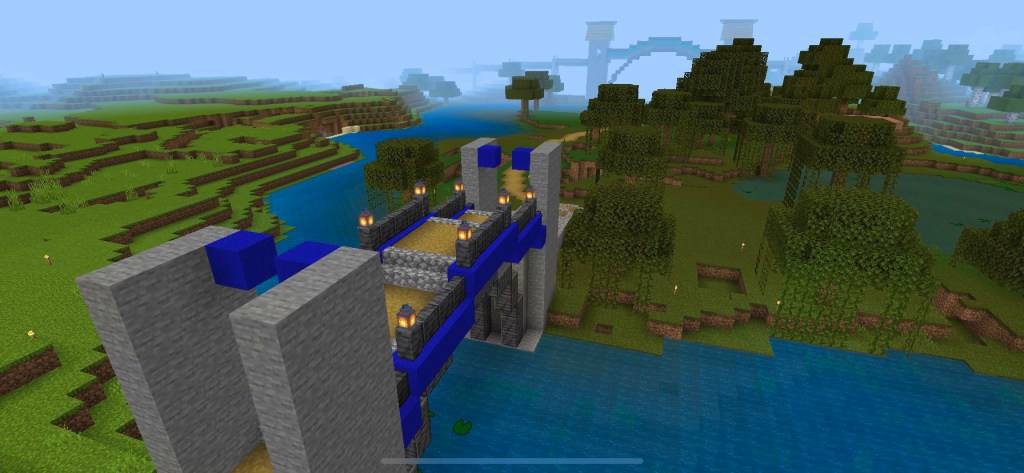 I built an edgy looking tower at the end of the moorland biome. The tower is in the far north east of the map it’s quite an ugly corner of the map. But from the tower there are views of mountain and jungle. After the tower (Bleak Tower) there is another medium sized iron arched bridge and then you’re heading south though mixed woodland and river.