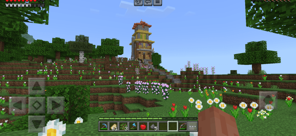 Once you’re over the pink bridge you’re into the flower fields. It’s a big flower biome. I put a small tower on the edge of the biome and snaked the track around the outside edge of biome, without smashing up much of it.
